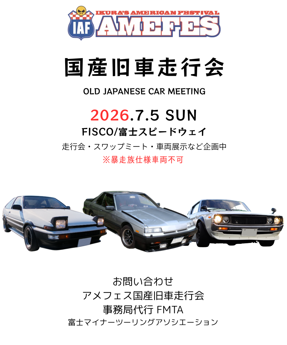 日時:2026年7月5日(日)場所:富士スピードウェイ IKURA's AMEFES2026内で国産旧車に限定した走行会・ス…